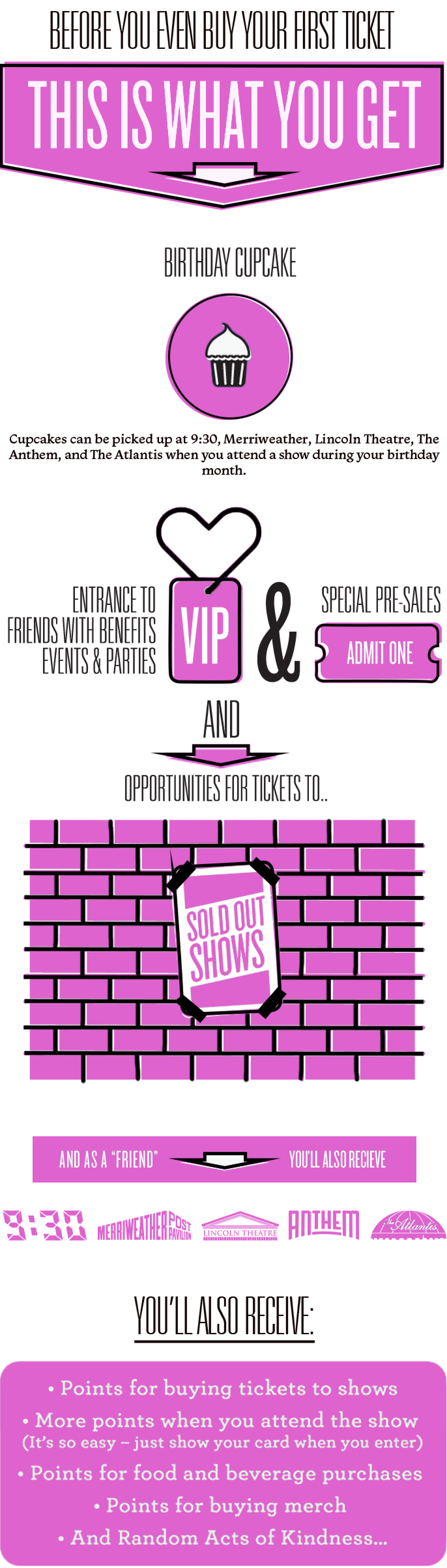 Friends with Benefits members earn points in a multitude of ways when attending shows at 9:30 Club, Merriweather Post Pavilion, The Lincoln Theatre, The Anthem and The Atlantis. Become a Friend with Benefits to receive exclusive presales and opportunities as well as reward yourself with even more tickets, merchandise, refreshments, and other I.M.P. awesomeness. You know it, we know it – it’s time to take our relationship to the next level.
